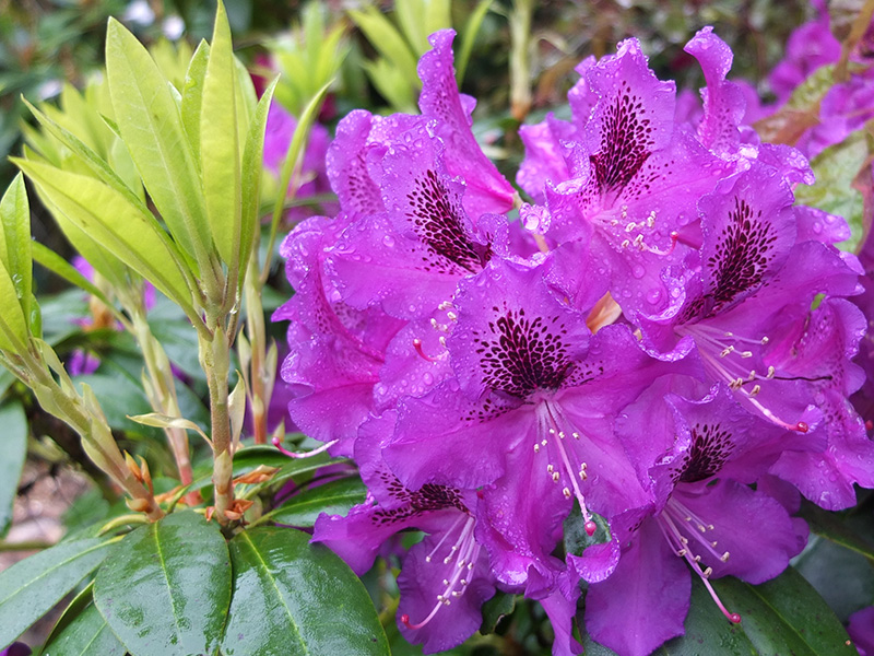 I have a dark purple rhododendron growing in the middle of Middle Garden. The purple flowers are a lovely colour combination with the late-spring greens, especially on an overcast day.