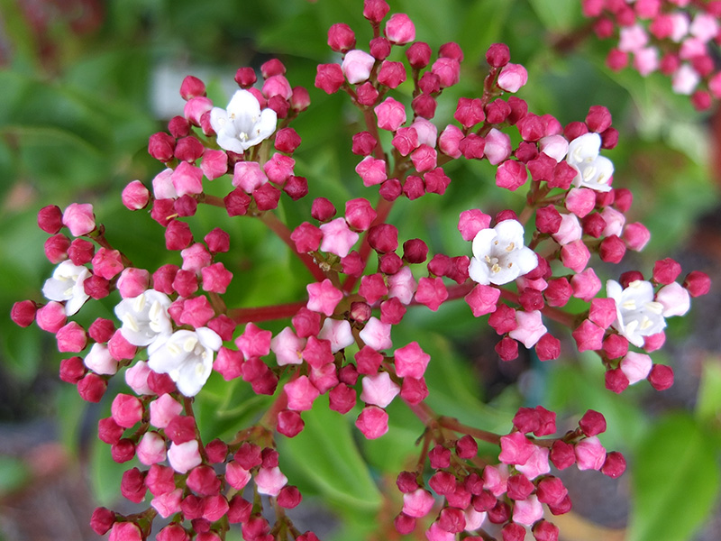The flowering time for Viburnum Tinus in my garden starts in March or April, which is almost the beginning of winter. The bushes are then covered with tight white flowers, with a pinkish tinge. After flowering the shrub produces small bluish berries.